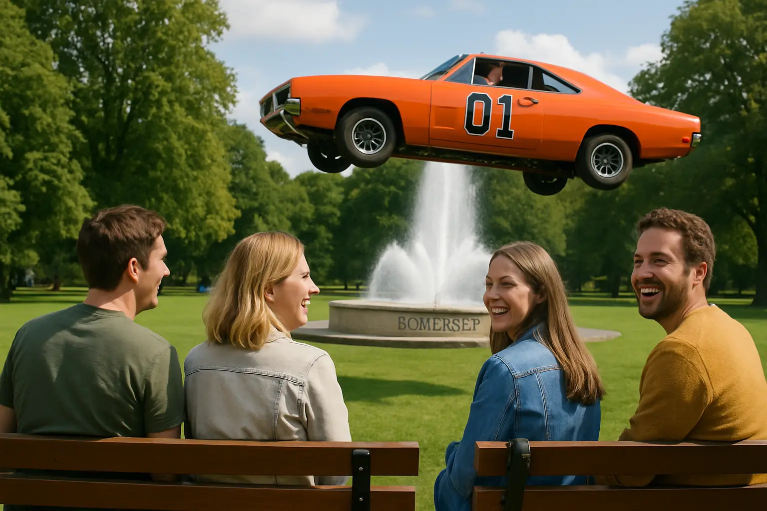 In a breathtaking moment that captured the spirit of classic American television and small-town grit, stunt driver Raymond Kohn sent a replica of the famed General Lee car soaring 150 feet in the air over the Fountain Square fountain at the 25th annual Somernites Cruise in Somerset, Kentucky. The crowd of over 35,000 witnesses erupted in awe as Kohn launched a modified 2000 Mercury Marquis, painstakingly recreated to look like the iconic 1969 Dodge Charger beloved from “The Dukes of Hazzard,” successfully clearing the famous town fountain in a stunt that blended nostalgia with dead-serious precision and heart. This gravity-defying jump not only paid tribute to a cultural icon but also symbolized the perseverance of American spirit, especially as Kohn himself overcame serious health challenges to make the jump happen.