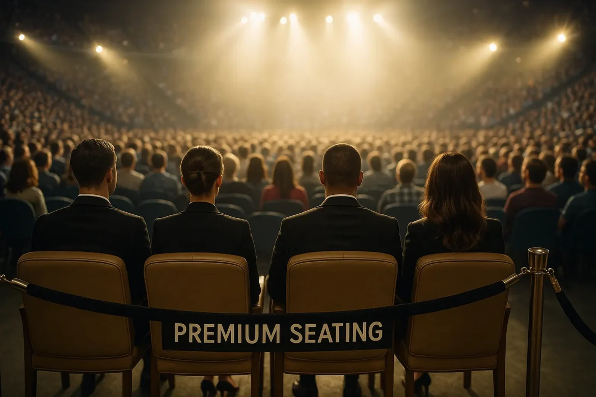 The rest of the venue tells a different story. Beyond the “First Class” five-row premium, prices nosedive – with seats just behind the big spenders selling for around $510, and general admission in the nosebleeds available for as little as $60, making the high-roller difference look even more dramatic.